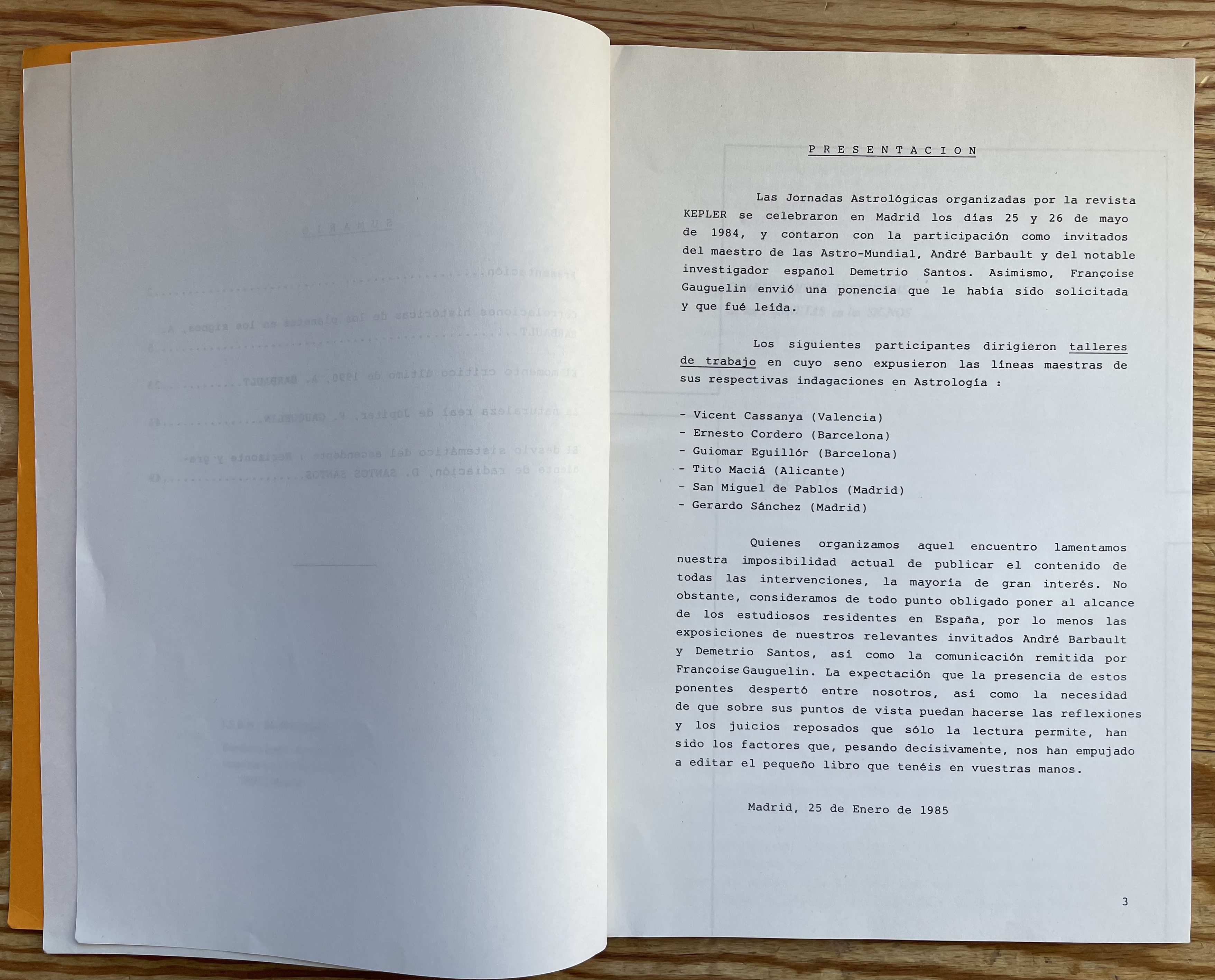 Ponentes: André Barbault, Demetrio Santos, Françoise Gauquelin, José Luis S. de Pablos, Guiomar Eguillor, Gerardo Sánchez, Vicente Cassanya, Ernesto Cordero, Tito Macià.
